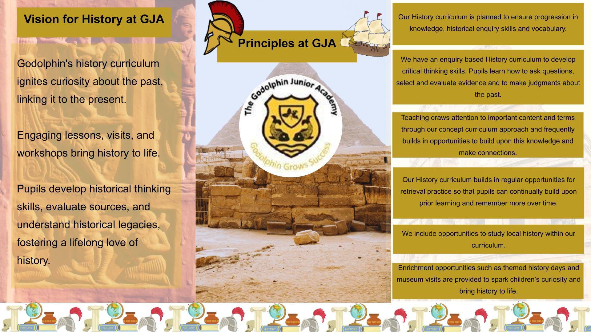 At Godolphin Junior Academy, we believe that History should ignite pupils’ curiosity to ask questions about the past and make links to the modern day world. We aim to bring History alive for our pupils through differentiated and engaging lessons. School visits and workshops underpin History as a valuable way of providing memorable first hand experiences to support pupils’ learning.